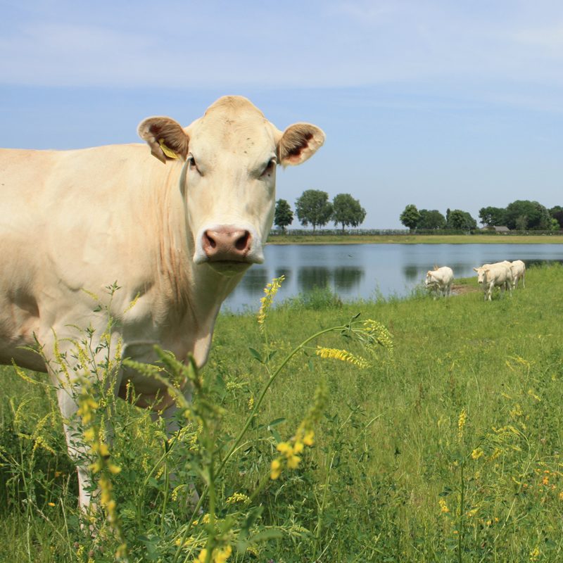 De velden waar de runderen en varkens in staan hebben een grote variatie aan gewassen. De runderen lopen in kruidenrijk weides en krijgen daarnaast in de winter luzerne van eigen land bijgevoerd.